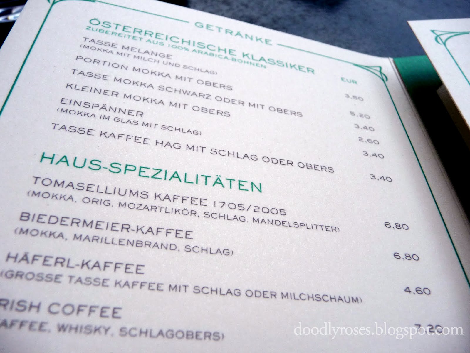 I wanted to try a coffee, because my boyfriend, CEO and food-blogger extraordinaire, had told me that I absolutely had to see what Austrian coffee was like. I’m not a coffee drinker, so thanks to being coffee-illiterate and German-challenged, I didn’t have a chance of understanding the menu.