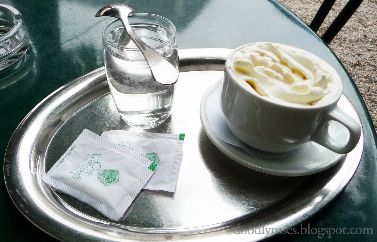 When the waiter came, I pitifully pointed to the very first thing on the menu without knowing what it was. I got the Tasse Melange, which according to the description is a mocha with milk and “schlag.” I had no idea what schlag was. Google tells me now that schlag is whipped cream.
